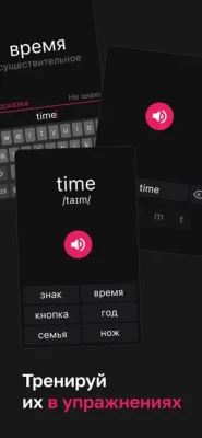 Неизвестные слова тренируются в специальных упражнениях: выбор правильного перевода из 6 вариантов, собирание слова из символов по аудио и написание слова с клавиатуры по переводу. Выбор правильного перевода формирует связь английский → русский. Собирание слова из символов после прослушивания произношения улучшает восприятие на слух. Написание слова с клавиатуры формирует связь русский → английский и развивает навык правописания.