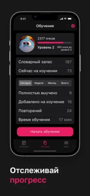По мере изучения новых слов у тебя будет расти уровень внутри приложения. Это поможет тебе сохранять мотивацию и не бросать занятия.