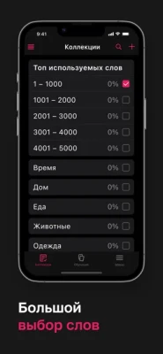 В Angry Words есть коллекции, в которых представлены самые распространённые английские слова, а также различные тематические коллекции. Всего в приложении около 6000 карточек. При желании можно добавить свои слова и создать свои коллекции для изучения.