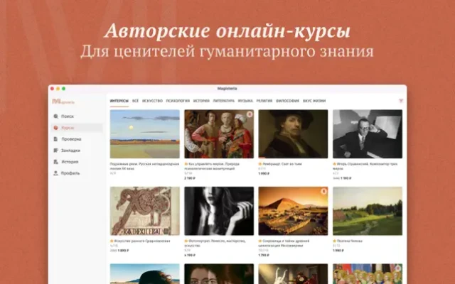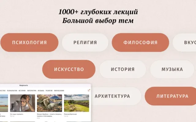 Курсы лекций по искусству, психологии, литературе, музыке, философии, религии, истории и другим дисциплинам.