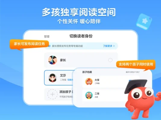 多孩独享阅读空间:支持家长、孩子多用户切换,家长可为孩子发布阅读任务,培养孩子阅读习惯,提高阅读能力。