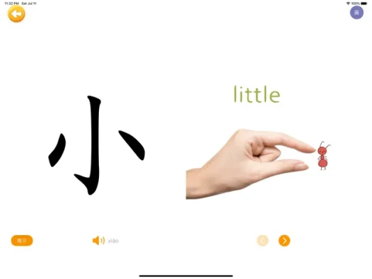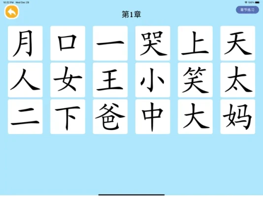 3、找汉字练习:在语音提示下,在18个汉字中找到所考汉字,难度适中,加深文字印象