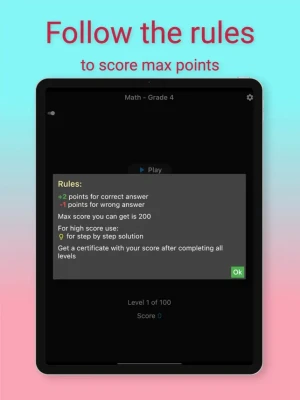 Challenge your mind with 4th grade level Math and see where you stand. There are 100 questions/levels sprinkled with some interesting Math puzzles in between. Create and share a certificate of your final score. Challenge your friends and family to see who can score the most.Watch step-by-step solution for better understanding of answers.