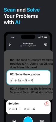 NoProblem allows you to scan any homework problem using your device’s camera. Our intelligent AI, built on the groundbreaking GPT technology, immediately provides comprehensive, step-by-step solutions. With coverage extending across a wide array of subjects such as math, physics, and chemistry, NoProblem offers real-time homework assistance whenever you need it.