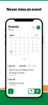 NEVER MISS AN EVENT The event section shows a list of events throughout the district. Users can add an event to their calendar to share the event with friends and family with one tap.
