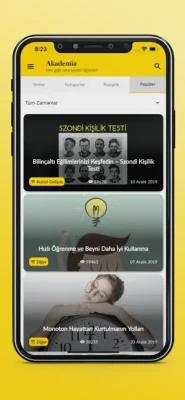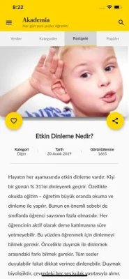 Akademia, mobil uygulamasında isterseniz rastgele seçeneğini kullanarak uygulamadaki herhangi bir makaleyi görüntüleyebilirsiniz. Uygulamanın çeşitli konulardaki makaleleri arasından ekranınıza gelen makale ile farklı bilgiler keşfetmeniz mümkün. Uygulamanın bu bölümüyle hem eğlenceli hem de verimli vakit geçirebilirsiniz.