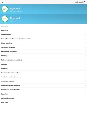 YourTeacher provides a complete curriculum for Pre-Algebra, Algebra 1, Algebra 2, and College Algebra with a personal math teacher. Search for the exact lesson you need or simply take the courses from start to finish. Every lesson features video instruction, guided practice, tests, background modules, diagnostic quizzes, worksheets, notes, and more. Track your progress with our dynamic grade report and use the chapter reviews and final exam to solidify your knowledge.