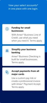 * With American Express Business Blueprint™, customers can view their select business products that automatically appear on their dashboards at login. These products include American Express® Business Line of Credit, American Express® Business Checking, American Express® Payment Accept, and American Express® Business Credit Cards. Customers may also view the eligible external business bank and card accounts they choose to link to Business Blueprint.