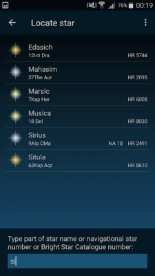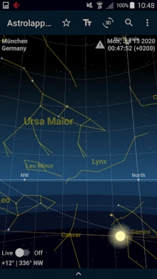 Stars are drawn according to their true color and provided with their names according to the International Astronomical Union. Optionally, the 88 official constellations are drawn with or without name labels. Use a powerful search function and let an arrow guide you to find any planet, star or constellation above your head.