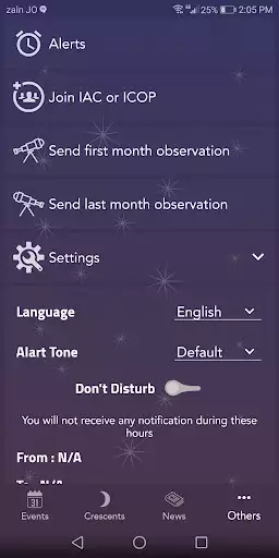 Never miss an astronomical event! Astronomy Events does not only list the important astronomical events, but it also sends you a notification to inform you about a current event. The user gets basic description about each event once the events is clicked. In addition, the application has a News menu in which you can find some important astronomical news. Moreover, you will receive Push Notification for important news such as seeing the crescent in a certain country. Also, the application has a tab for crescent sighting, in which the user can view crescent sighting predictions for the current year and can also read the crescent observation results of the previous months. The events which this application lists and send push notification for are:-