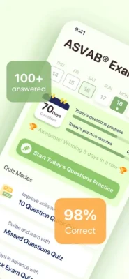 ASVAB Practice Test Prep 2024 is a test preparation app that will help you pass the Armed Services Vocational Aptitude Battery (ASVAB) Test with a high score and get your ticket to a military career in the United States.