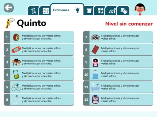 12 niveles de operaciones por curso de dificultad creciente: sumas, restas, multiplicaciones y divisiones. Se puede practicar de manera infinita, porque la app genera operaciones distintas cada vez que se selecciona un nivel.