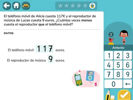 La app guía a los niños/as para que aprendan a extraer los datos de cada enunciado y a elegir la operación adecuada para obtener la solución correcta.