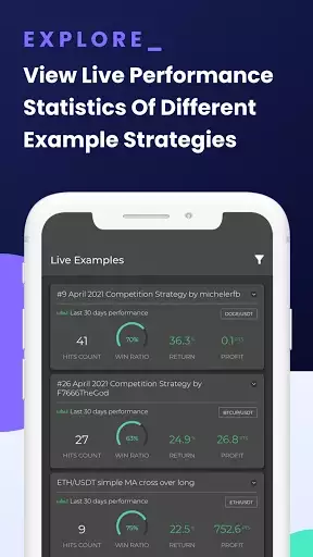 View live performance statistics of different example strategies and select your favorite ones with the click of a button.