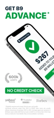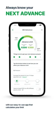 Access your pay in advance. B9 enables you to access your earnings as you work, eliminating the usual delays of days or weeks. All with no loans, no borrowing money, no interest, and no credit checks.Experience the benefits a of B9 Advance℠ where you can access from $30 to $500 from your paycheck to handle your everyday expenses, unexpected bills, and so on.[1] What's more, our credit monitoring feature is included in the B9 Premium Plan, ensuring your credit goals stay on track, all conveniently within the app.