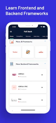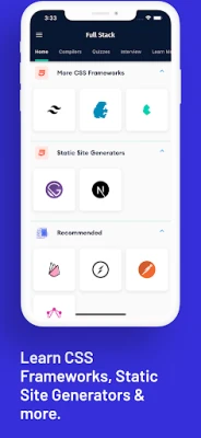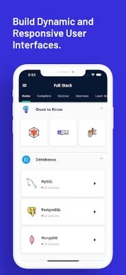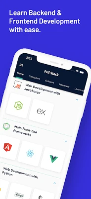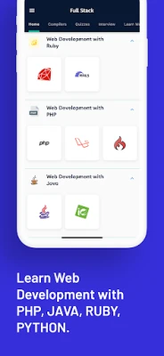 Our app covers all the essential concepts and tools you need to become a full stack developer, including frontend development with HTML, CSS, and JavaScript, web development with popular backend frameworks like Django, Flask, Laravel, CodeIgniter, Ruby on Rails, and Spring, and libraries like Firebase, GraphQL, Webpack, and Postman. We also provide a compiler for many programming languages, as well as interactive quizzes, interview questions, and other features to help you assess your progress and stay engaged in the learning process.