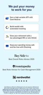 As an independent digital investment advisor and fiduciary, Betterment is built to help you do what’s best for your money so you can live better. With no minimum balance, you can get started with just $10 in minutes. Keep track of your financial life across your short- and long-term savings goals with our easy-to-use app.