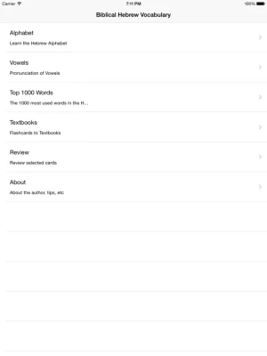 The Biblical Hebrew Vocabulary App is designed to help students study and review the 1000 most frequent words in the Hebrew Bible, as well as lessons from the most popular Hebrew textbooks.