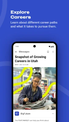 BigFuture® School is a free mobile app for students 13 and over who take the digital PSAT/NMSQT, PSAT 10, or SAT School Day in the United States and provided their mobile phone number. To access the app, you'll need to use the mobile number you provided when you took your test. This account information is separate from your College Board account.