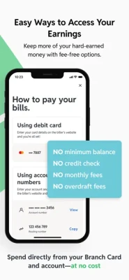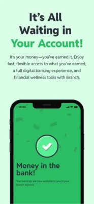 Welcome to a better payday. One with fast, flexible payout options for your earnings—whether that’s wages, tips, mileage reimbursements, direct deposit, or more. When your company offers Branch, you can receive a free digital bank account and debit card that you can take with you for life, plus free financial wellness tools right at your fingertips. And it’s all possible through our simple, 90-second signup.