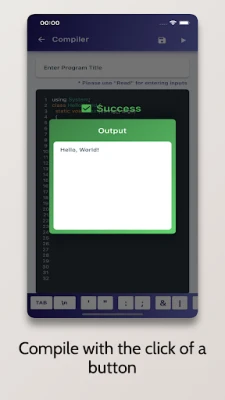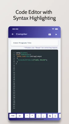 C# Compiler is an Advanced IDE enabling you to compile C# Programs on your Mobile Phone for Free. It comes with a code editor with in-built syntax highlighting capabilities.