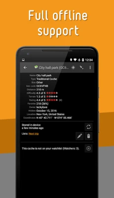 Store cache information to your device directly from geocaching.com as well as via GPX file import to have it available whenever you want.