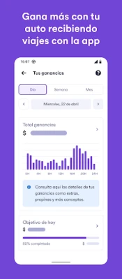 Te mostramos en la aplicación las zonas de la ciudad con más demanda de viajes para que puedas moverte hacia ellas y recibir más servicios e ingresos como driver. Con nosotros, tu tiempo vale más.