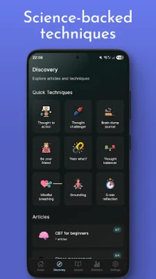 Cognitive patterns drive emotions and actions; behavioral practice rewires response. Evidence-based therapy helps you challenge unhelpful beliefs and build calmer habits. Designed with therapist-informed structure so you get the benefits of therapy even when a therapist isn’t available. Clear, practical steps you can use between sessions or without a therapist.