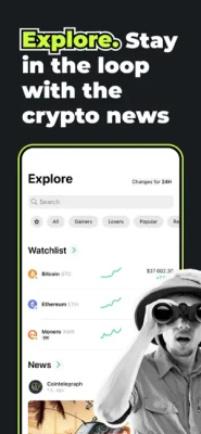 Strive to learn more about the cryptocurrency market? With the Explore feature, you can analyze the crypto industry according to real-time market statistics! Follow and read the most recent insights on crypto from handpicked news providers on the go. Filter, add to bookmarks, and share the most exciting crypto news with friends. Add favorite coins to your Watchlist and track their ups and downs.