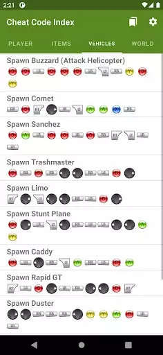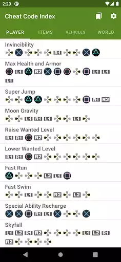 All 31 cheat codes for the game are available. This app only contains codes for version 5 of a specific car/auto theft game. The cheats are grouped by category (Player, Items, Vehicles, World). The app provides a 'Favorites' feature.