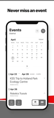 NEVER MISS AN EVENT The event section shows a list of events throughout the district. Users can add an event to their calendar to share the event with friends and family with one tap.