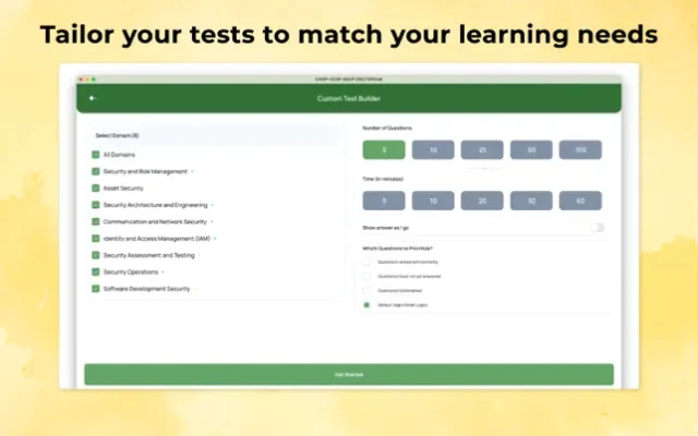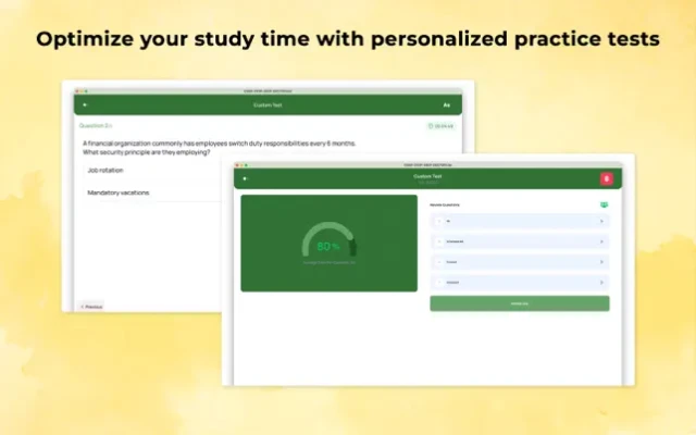 Personalize your practice with our custom test builder feature. Select specific topics and questions to create tests tailored to your needs. The test engine generates personalized tests with a mix of new and your weakest questions, helping you focus on the areas where you need the most improvement.