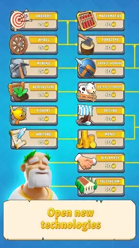 But there is no progress until you know your ultimate goal! And that goal is represented via the huge and diverse skill tree. It has many branches of development and upgrades. Each branch covers different types of technologies. From fishing and farming to ship building and siege weapons. You can unlock the secrets of economics, philosophy, and military prowess to help you on your quest to greatness.