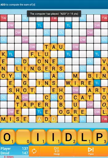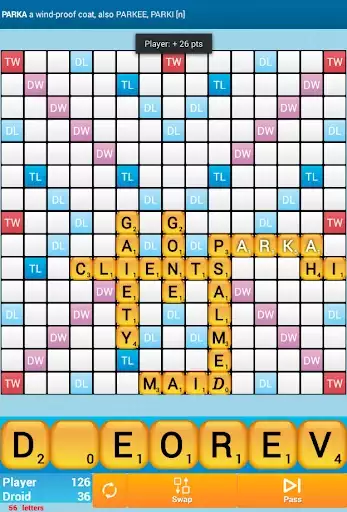 Choose the skill level of the computer (from beginner to expert), pick a word list (English word lists include the latest NASPA Word List 2020), and use your strategy skills and vocabulary to try and defeat the Droid.