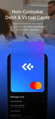 Transact with over 40 million merchants in more than 200 countries using our non-custodial debit card. Spend your stablecoins and crypto with zero third-party risks; you're in charge of your funds at every step.