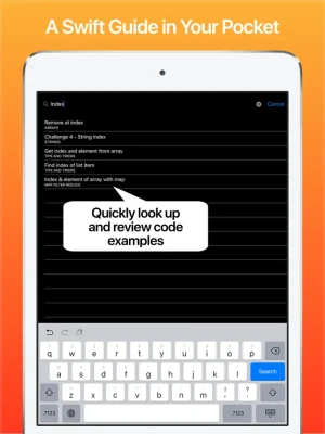 Code Swift also acts as a Swift Guide in your pocket. Have a question or need a quick refersher on a specific topic? Just use our powerful search feature to instantly find great examples and code snippets with detailed explanations.
