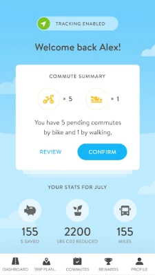 To get started, just install the app. Follow the simple steps to connect to the participating commuter program from your employer or region and tell us about your typical commute habits.