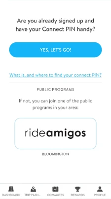 Note: To use this app, you’ll need a free Connect PIN from a participating commuter program powered by RideAmigos. If you are not sure how to get a Connect PIN, contact RideAmigos to find out if there is a commuter program in your area: appsupport@rideamigos.com”