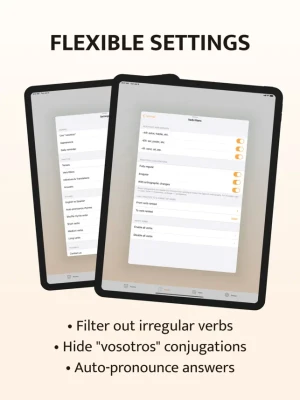 • Flexible settings: practice verbs based on irregularity, endings or popularity