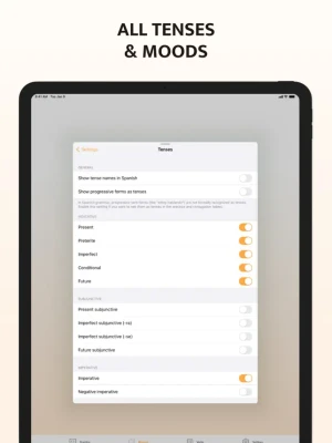 • All tenses: Present, Preterite, Imperfect, Pluperfect, Conditional, Future, plus their perfect aspects and progressive (continuous) forms
