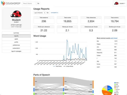 CoughDrop runs on multiple devices, so you can log in on your tablet, phone and computer and have access to the same communication tools and interface. In addition, users can be linked so parents, therapists and supervisors can access a communicator's boards from their own devices to better facilitate modeling, and to make it easier to modify boards without taking away the communicator's device. The built-in reporting and messaging tools also help the support team have a consistent strategy and know what's working across locations and times.