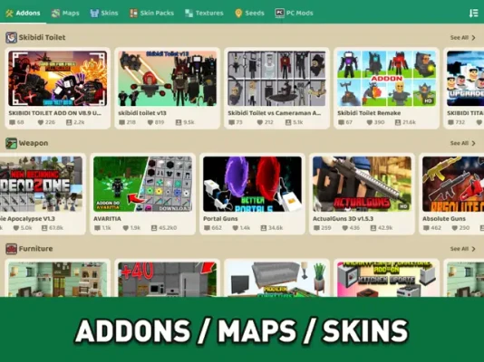 Download the most popular Addons, Skins, Maps & Textures, or create them with our advanced tools.