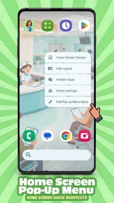 This feature provides quick shortcuts directly from your home screen. When you press and hold an empty area on your home screen, a pop-up menu appears with shortcuts to key features of the Launcher, such as "Home screen design".