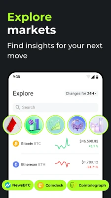 The Explore feature in Changelly app lets users track crypto market movements and stay informed on cryptocurrency news and updates. It displays exchange rates and prices for various cryptocurrencies, including Bitcoin, and provides access to news and analysis from top sources such as BTC, Bitcoin, and BNB news. The function also allows users to track Bitcoin and other crypto markets, view BTC dominance, and follow the latest trends. Whether you're a seasoned trader or a new crypto enthusiast, Explore is an essential tool for staying informed on the latest crypto market developments.