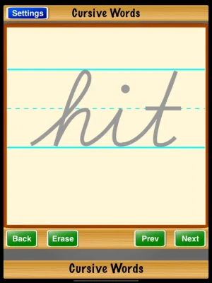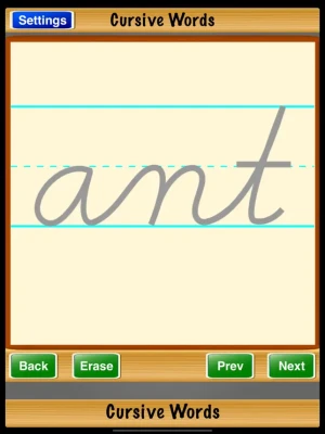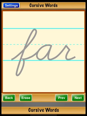 Cursive Words is a great way for the family to practice cursive writing. Select the options in the "Settings" screen. Play until you master the game.