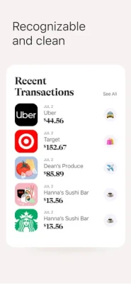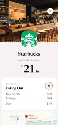 Get the picture, map and logo of your merchant. See how this purchase affected your overall category spend for the month as well as the history of your spend with this merchant. If you added a tip, you’ll see a red heart next to it. Now you can understand and get the full context of all your spending habits.