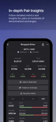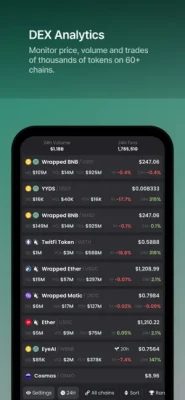 - Real-time charts and trades - Unlimited watchlists - Unlimited price alerts - Customizable screeners with several metrics such as volume, price change, liquidity and market cap - Support for 60+ chains, hundreds of DEXes and hundreds of thousands of pairs