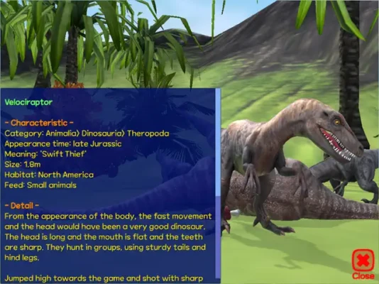 Move, hunt, and take photos of 15 different dinosaurs.You can meet dinosaurs that don't existLearn about dinosaur types and features in Dinosaur Encyclopedia.