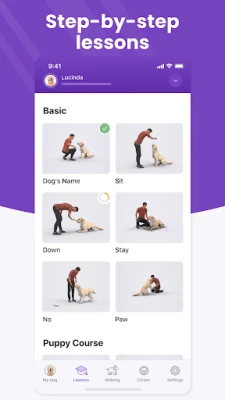 Here you will find a full lesson’s pack with step-by-step video instructions verified by professional dog trainers, built-in dog whistle and clicker, health and care diary, time walking schedule, useful articles, and other features that help your dog stay healthy and happy!