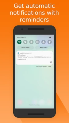 Managing your bills is easy: just set the name of the bill, the amount, and the due date. A few days before the bill is due, you'll start receiving automatic reminders to pay the bill, and you don't even have to open the app to keep track of it!
